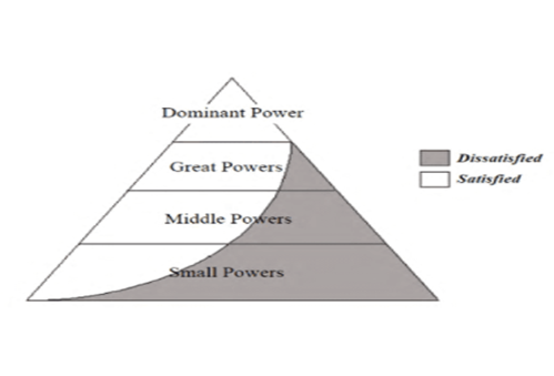 Bu piramitte dominant nation olarak ekonomik askeri ve siyasi alanda statükoyu düzenleyen ülke yer alırken hemen altindan bu statükodan memnun kalan ülkeler ardindan brezilya ve hindistan gibi orta güce sahip ülkeler fakat dominant güncel meydan okuyabilecek bir seviyeye ulaşabilir olmayan ulkeler yer alir. Piramidin en alt kısmında ise sayısal olarak en geniş grubune ve ena az güce sahip olan ülkeleri kapsamaktadır. Mevcut statüko dan memnun kalan kısım farklı ittifaklar kurarak bu statükoyu korumaya yönelik faaliyet yaparken memnun olmayan ve bu sistem içerisinde yeni statüko arayışında olan devletler ise ekonomik ve askeri anlamda kuresel veya bolgesel rakip olabilecek guce sahip oldukları zaman uluslararasi duzenin istikrari açisindan tehdit oluşturmaya baslayacaktir. (DULKADİR, 2020)